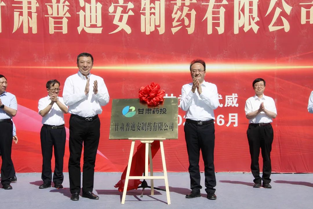 奠基儀式由武威市委常委、常務副市長白振海主持,市委常委、涼州區委書記李萬岳、甘肅藥業集團黨委副書記、總經理竇生銘先后致辭講話。市委副書記、市長王國斌與甘肅藥業集團黨委書記、董事長魏陽為甘肅普迪安制藥有限公司揭牌并宣布項目開工建設。