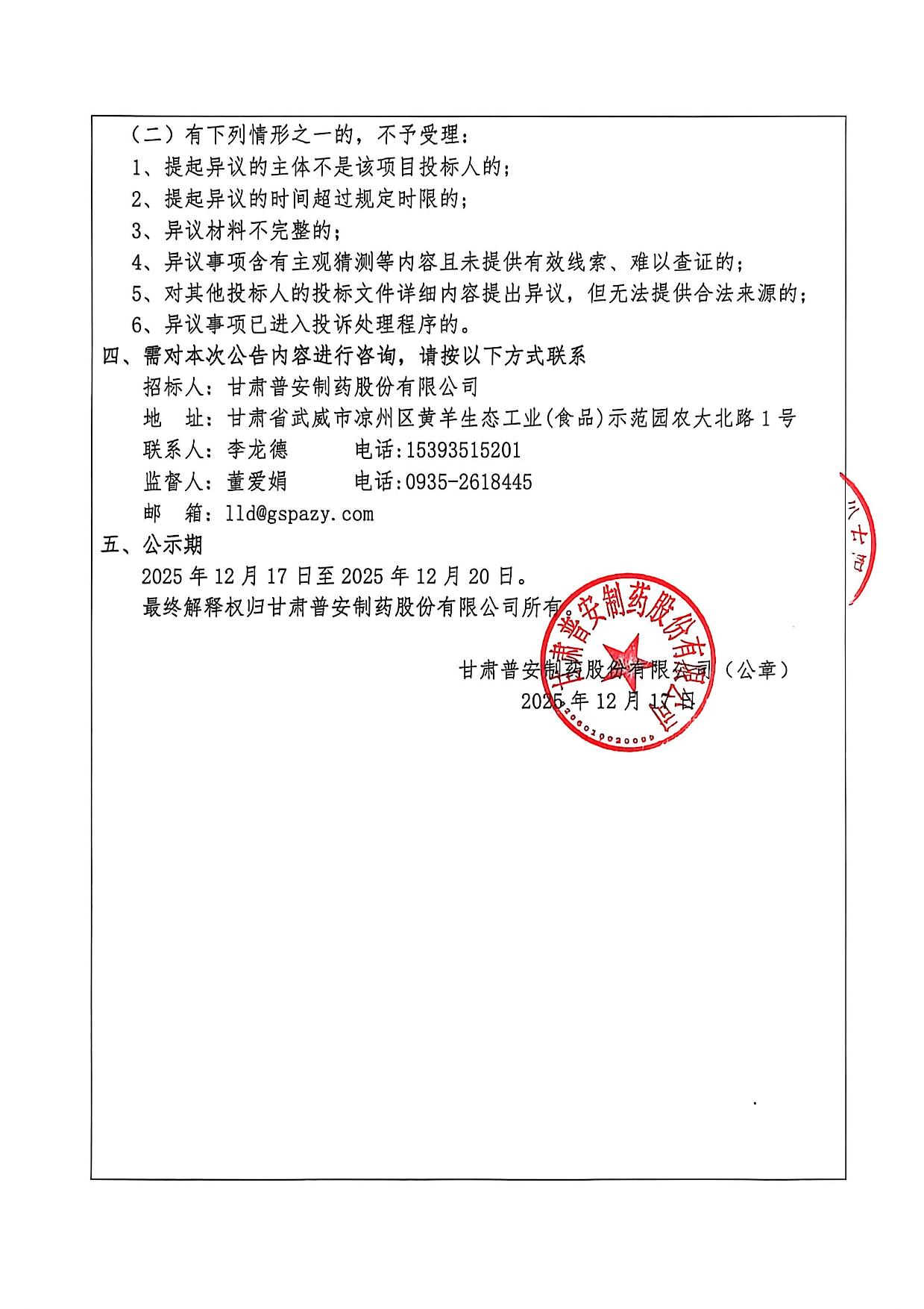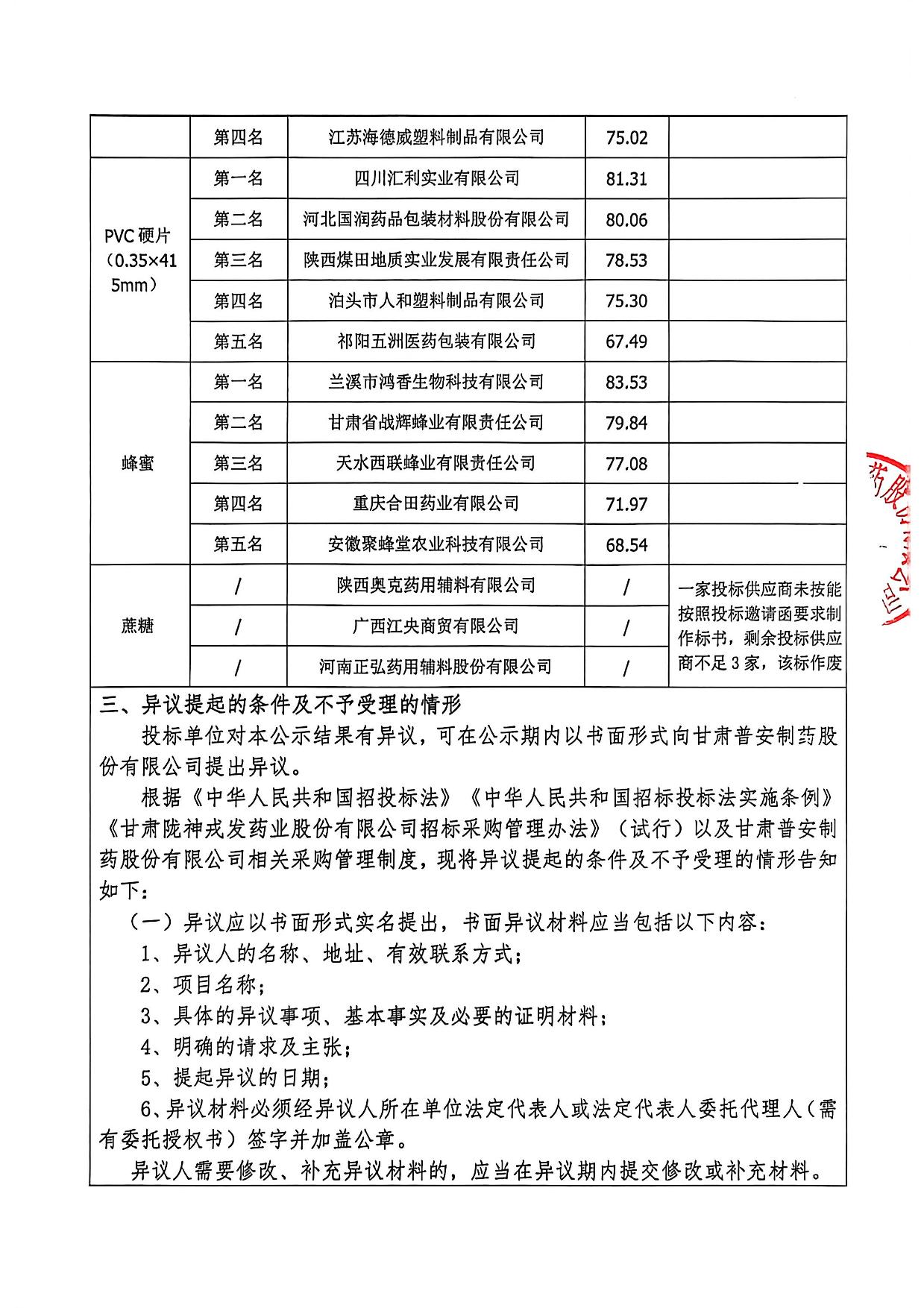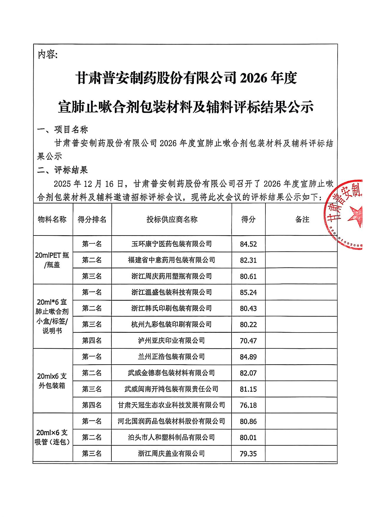 甘肅普安制藥股份有限公司2026年度宣肺止嗽合劑包裝材料及輔料評標結果公示